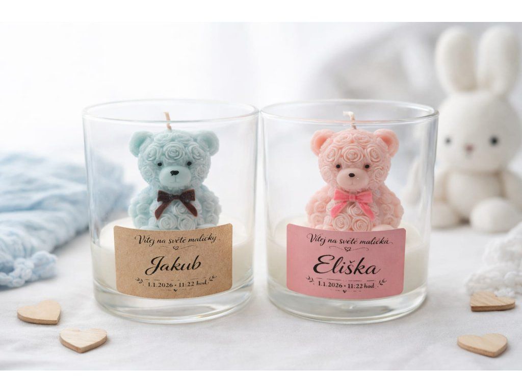 Ručně vyráběná svíčka ze 100% sójového vosku s jemnou květinovou vůní. Růžový medvídek s cedulkou z ní dělá osobní dárek k narození holčičky.